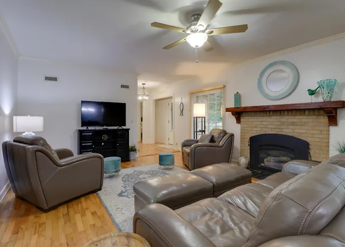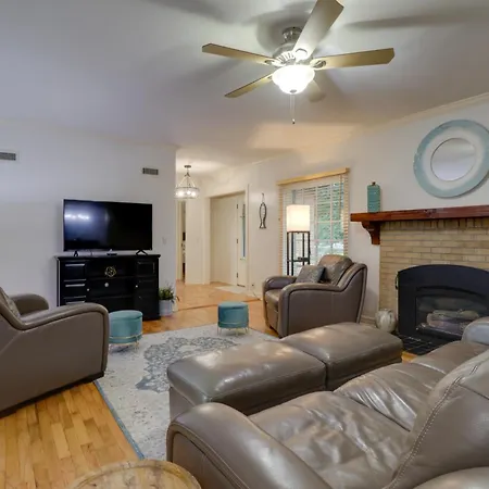 10 Mi To Grand Lake Home With Game Room In Jay! has an equipped kitchen with a refrigerator, a cooktop, and kitchenware. This Eucha property is within reach of quick bites McDonald's. Fayetteville, AR airport is 65 km away from the 3-bedroom holiday home.